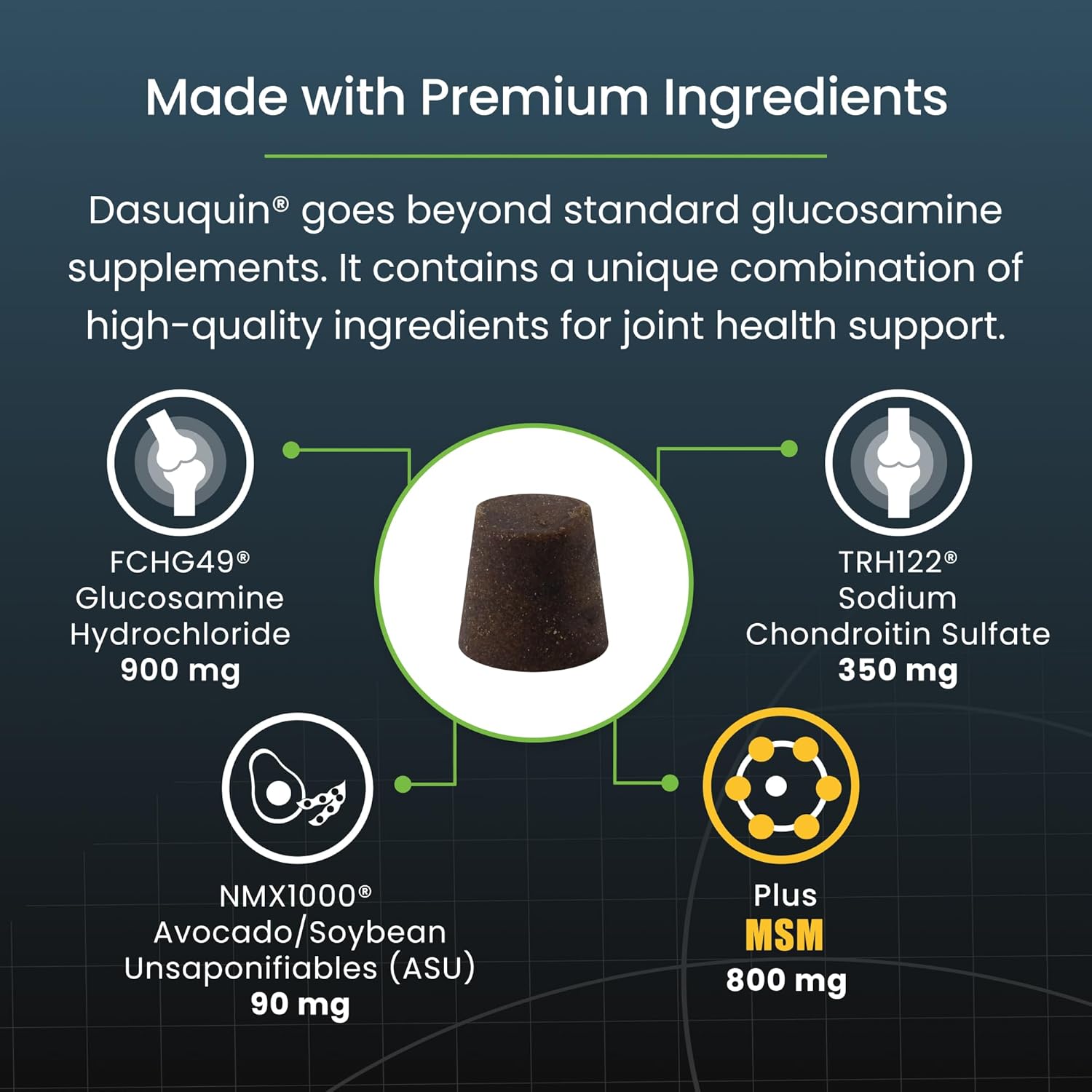 - Patented Formula - With a unique combination that contains glucosamine hydrochloride (FCHG49), sodium chondroitin sulfate (TRH122), ASU (NMX1000), methylsulfonylmethane (MSM), Boswellia serrata extract, and green tea extract, Dasuquin helps support your dog’s joint health.
