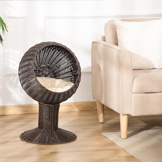 PawHut Elevated Cat Bed with Rotatable Egg Chair Pod, Cat Basket Bed with Thick Cushion, Natural Mat Grass Woven Kitty House, Coffee