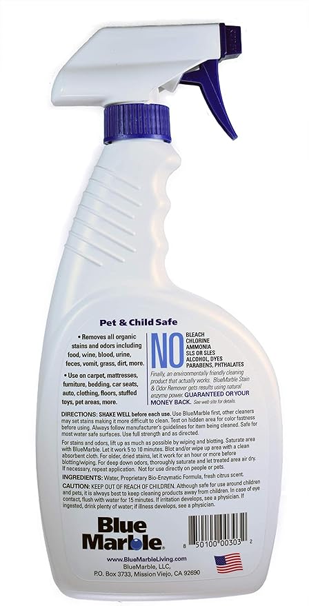 Blue Marble Stain & Odor Remover is Professional Strength, Eliminates Urine, Feces and Other Organic Stains & Stink Using Natural Enzyme Power. Great For Dogs, Cats, Pets, People and Other Accidents.