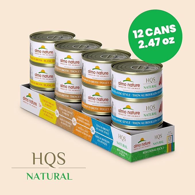 almo nature Wet Cat Food HQS Natural Rotational Diet Chicken & Tuna Selection-Variety Pack, Grain-Free, High-Protein, Highly Digestible, Sensitive Stomach Formula, Additive-Free, 2.47 oz Cans,24-Pack