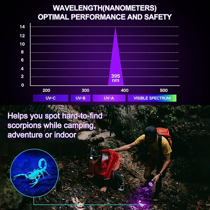 - Quality Assurance: The Black Light Emits 395nm wavelength with 51 top quality flashlight, each LED lasts up to 12 years. Heavy Duty Aluminium Alloy Blacklight Flashlight for this urine detector.