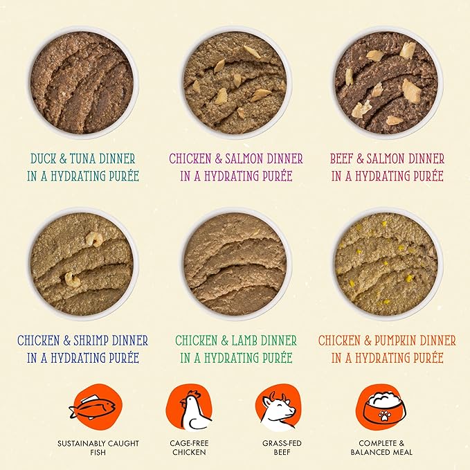- The Brat Pack Variety Pack (3oz Pouch, Pack of 12) Featuring cage-free chicken, duck, grass-fed lamb, and wild-caught salmon gently pureed into a creamy and delicious pate. Convenient Slide N' Serve pouch makes meal time fun and easy!