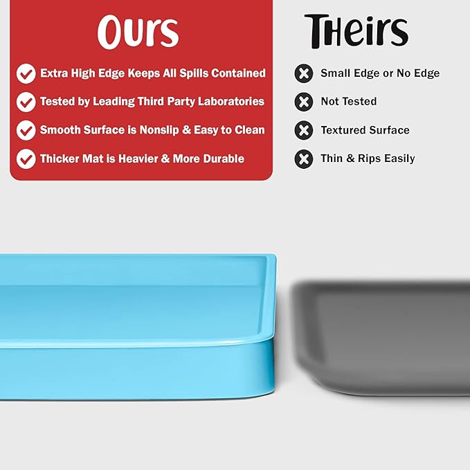 - Less Mess & Less Stress: Super high edge (0.6”) of DogBuddy Dog Food Mat keeps the spilled food and water on the mat and away from your beautiful floor. Silicone is naturally 100% waterproof, so what happens on the mat stays on the mat.