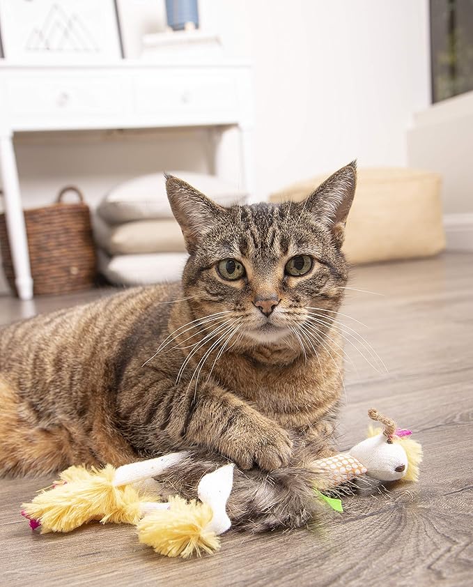 - MULTI-TEXTURED: Different material textures work to mimic the feel of real prey; featuring soft plush, long faux fur, ribbons, and rope to further satisfy your cat's hunting instinct