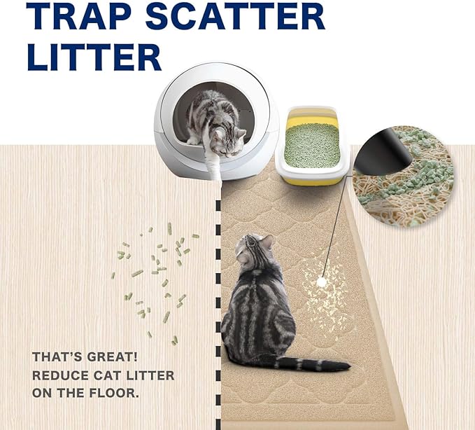 - [DESIGN]: With creative design upgraded based on repeated tests, this mat features deep groove and superior mesh, using carpet fiber technology to stop litter dropping onto floor or sticking to furry paws. The mat is large enough so that you have less sweeping to do around the litter box.