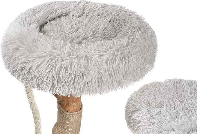 - BEAUTIFUL & UNIQUE DESIGN: Unlike most cat furniture, this wooden cat tree tower will enhance the look of your home. It includes two beautifully crafted, one of a kind trunks that hold a faux fur covered platform and an extremely comfortable bolstered bed. It is perfect for your kitty to have a glorious time napping while you can enjoy looking at a beautiful piece of art that adds to your homes aesthetics.