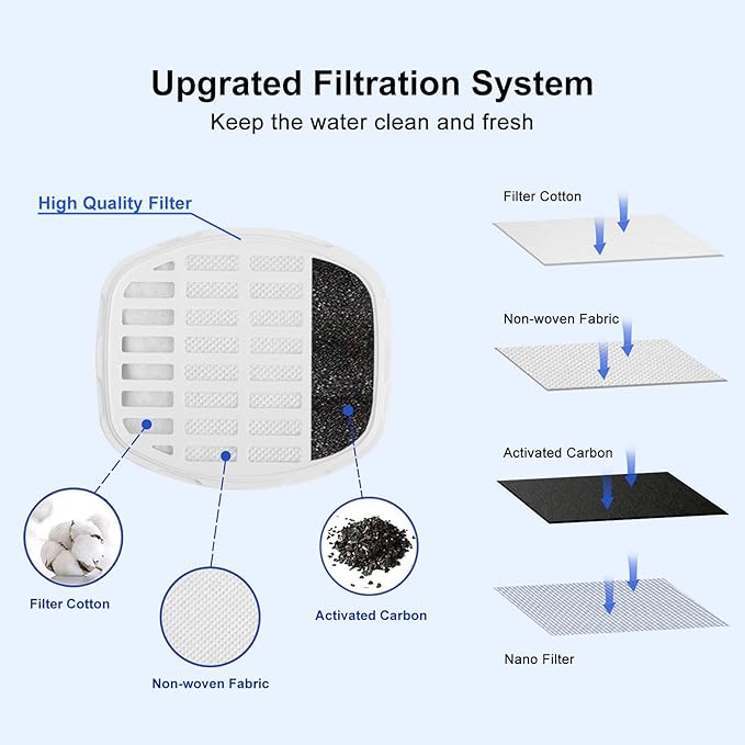 - 【Warm Notice】Please SOAK the filter completely before use to prevent water from overflowing ;To maintain clean and healthy drinking water for your pets, we recommend replacing the fountain filter every month and cleaning the pump's filter regularly