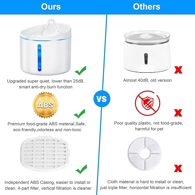 - 【Easy to use & Visible Water Level】Setting up our pet fountain takes just a few minutes, and it is easy to clean and disassemble; The transparent water level window, equipped with an LED light, helps you monitor the water level during both day and night; When the water level becomes low, the light turns red, prompting you to add water, and the pump automatically shuts off