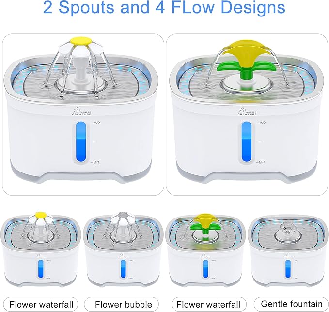 - 2 spouts and 4 modes: A source of running water encourages pets to drink more rather than still water. This fountain has 2 spouts and 4 different drinking modes. It provides more options for your pets and attracts them to drink more water.