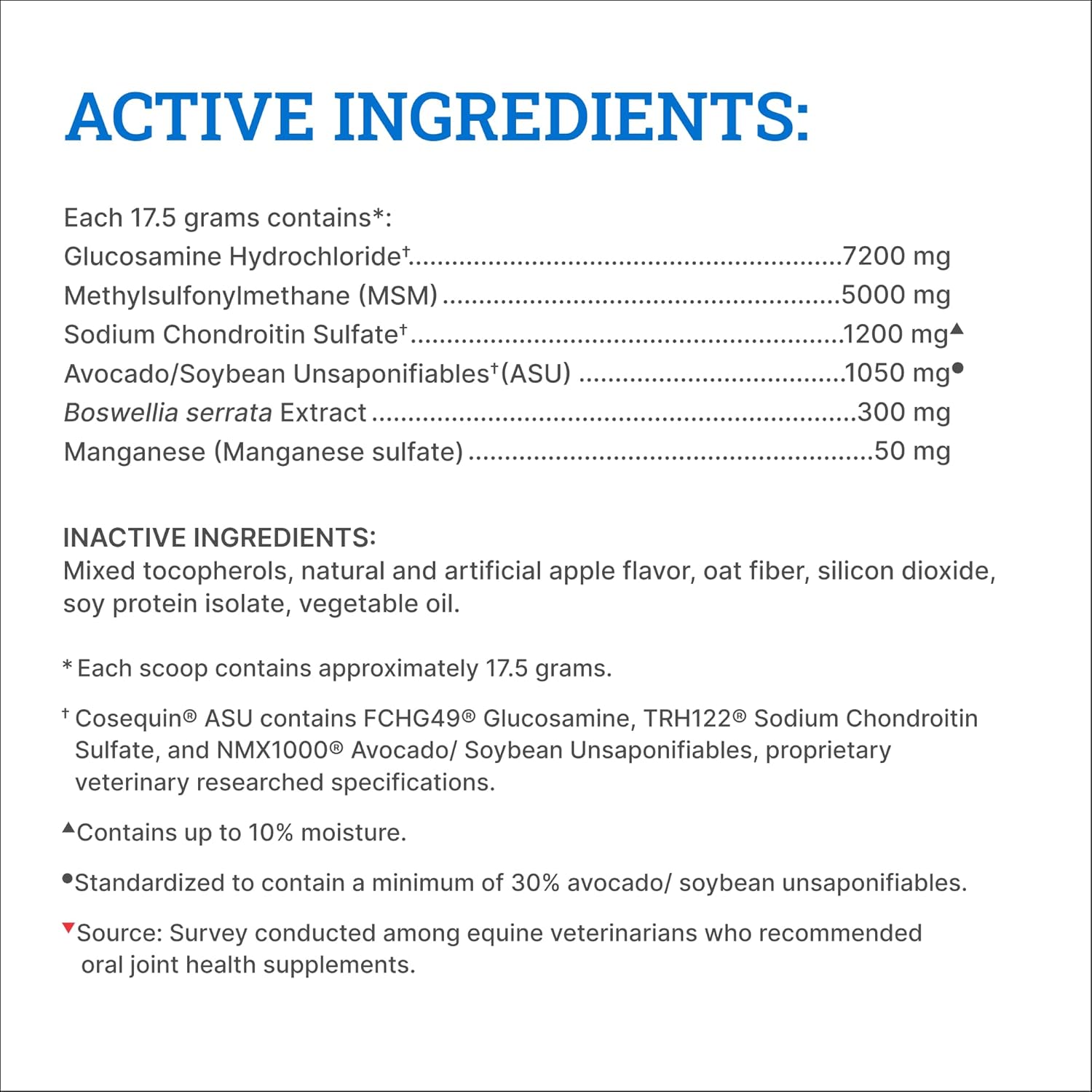 - Joint Health Support for Horses: Cosequin is the #1 veterinarian recommended joint health supplement brand*. This supplement is formulated with glucosamine, chondroitin sulfate, methylsulfonylmethane (MSM), and avocado/soybean unsaponifiables (ASU) to support joint health