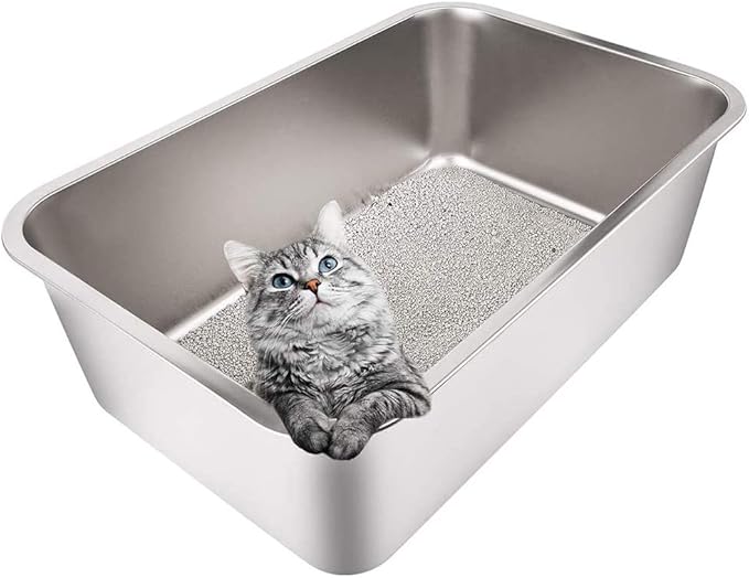Yangbaga Stainless Steel Litter Box for Cat and Rabbit, Large Size with 8in High Sides and Non Slip Rubber Feet. Odor Control, Non Stick Smooth Surface, Easy to Clean, Never Bend