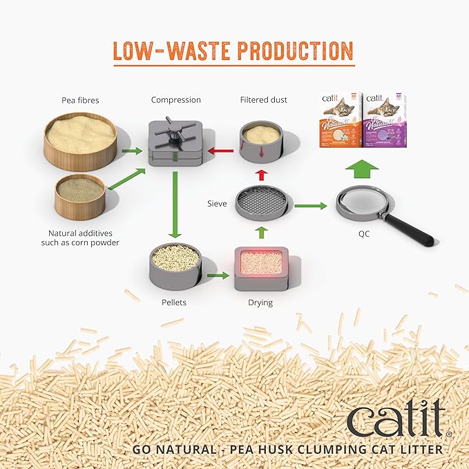 - Tight Clumping - Catit Go Natural Pea Husk Litter is a strong clumping cat litter for easy and dust-free litter box management. Catit’s litter composition decomposes naturally and can be safely flushed down the toilet, reducing waste and minimizing impact