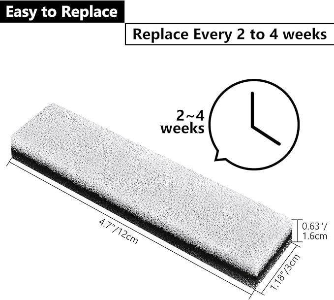 - 【COMPATIBILITY】Pet fountain foam filter replacement is only compatible with WF020 Fully transparency pet water fountain, with size of 4.7" x 1.18" x 0.63"(12cm x 3cm x 1.6cm)