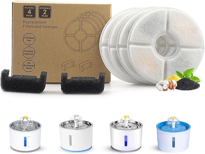 - 【4Pack Filters and 2 Pack Sponges】Package includes 4 pack pet fountain replacement filters and 2 Pack Replacement Pre-filter Sponges. They are individually packaged and sealed to maintain high quality.