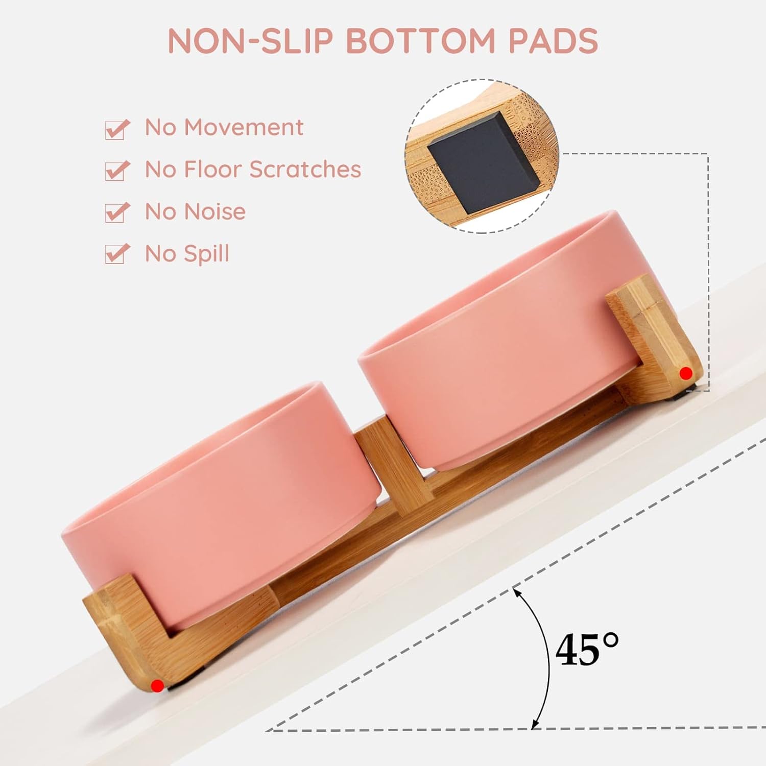 SPUNKYJUNKY Ceramic Dog and Cat Bowl with Wood Stand Non-Slip Matte Glaze Weighted Food Water Set for Cat Medium Dog 28.7 OZ