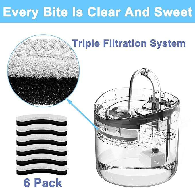 - [Triple Filtration System] HAPUP Pet water fountain filters are composed of a white high-density filter cotton layer, black high-content activated carbon, and an black ion exchange resin. Sponge could catch cats hair and debris, the ion exchange resin layer could soften the tap water, the carbon layer could remove bad taste. The cat fountain filter can effectively maintain water quality by the multiple filtrations to provide good and hygienic water to pets.