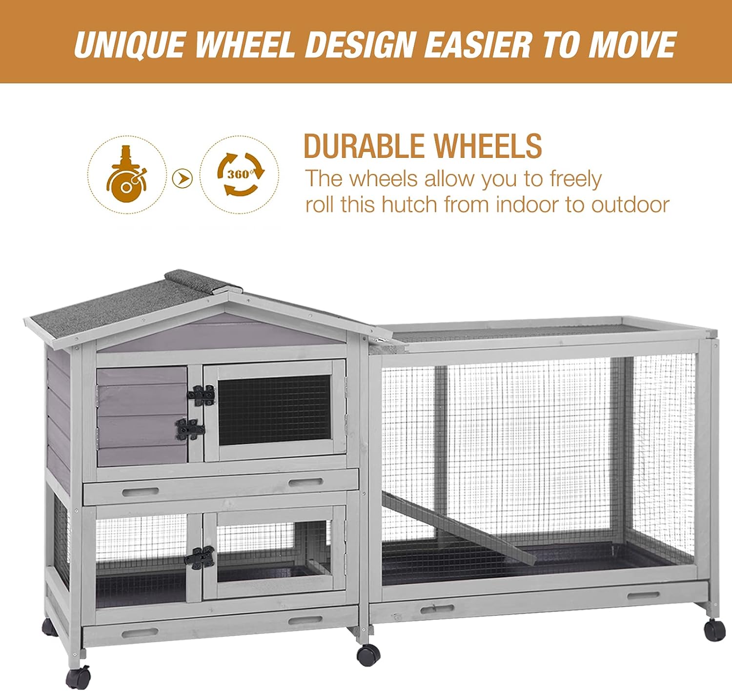 Bunny Cage Indoor and Outdoor Rabbit Hutch with Casters Waterproof Roof, Pull Out Tray from Back and Front 61.2" L x 22.6" W x 33.5" H