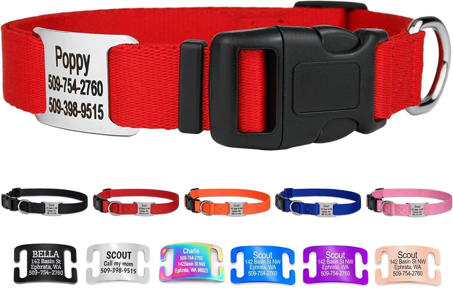 GoTags Personalized Dog Collar with Nameplate, Adjustable Dog Collar with Custom Engraved Slide On Pet ID Tag in Stainless Steel, Silent, No Noise Dog Tag for Large Medium and Small (Red, Large)