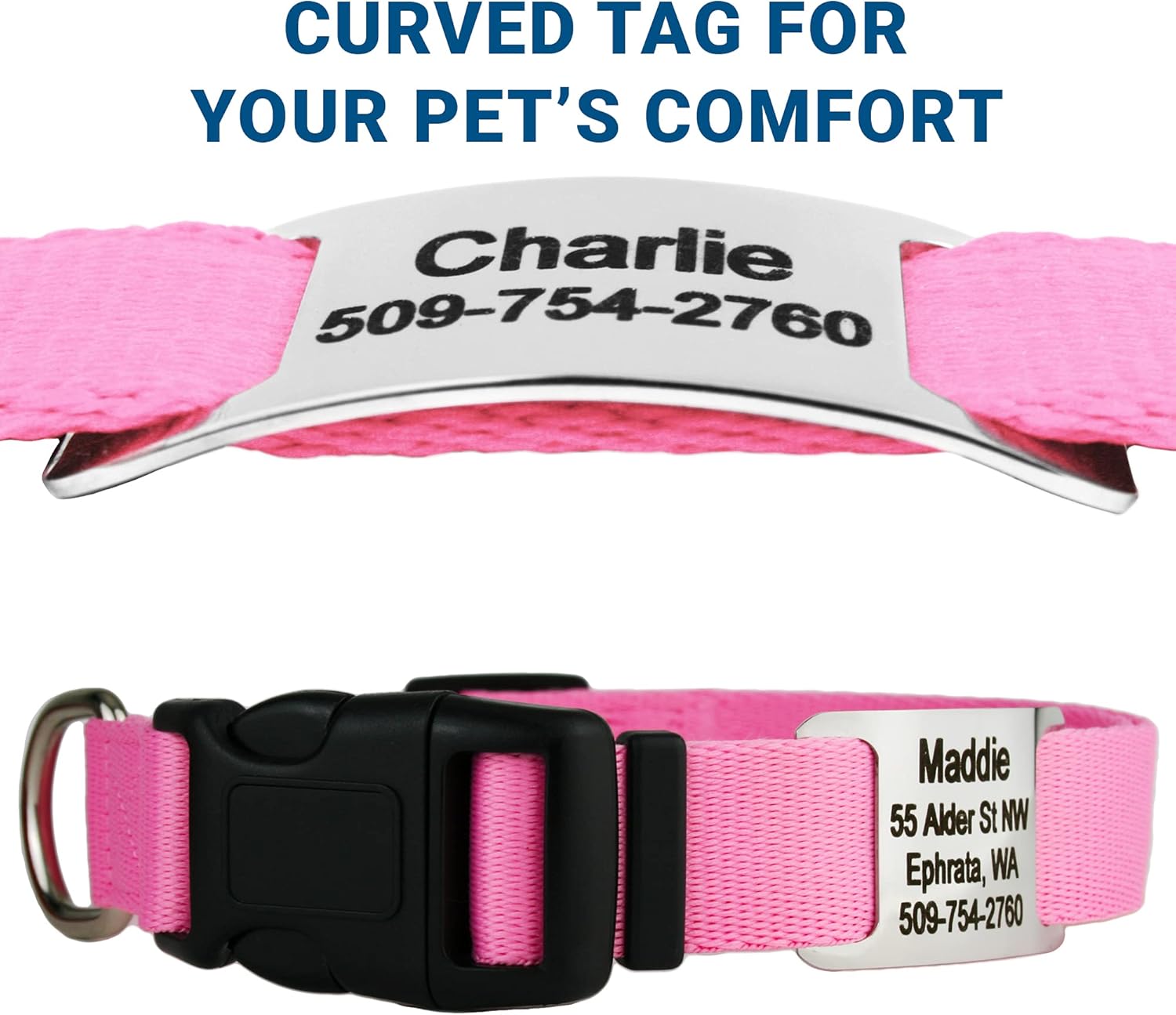GoTags Personalized Dog Collar with Nameplate, Adjustable Dog Collar with Custom Engraved Slide On Pet ID Tag in Stainless Steel, Silent, No Noise Dog Tag for Large Medium and Small (Pink, X-Small)