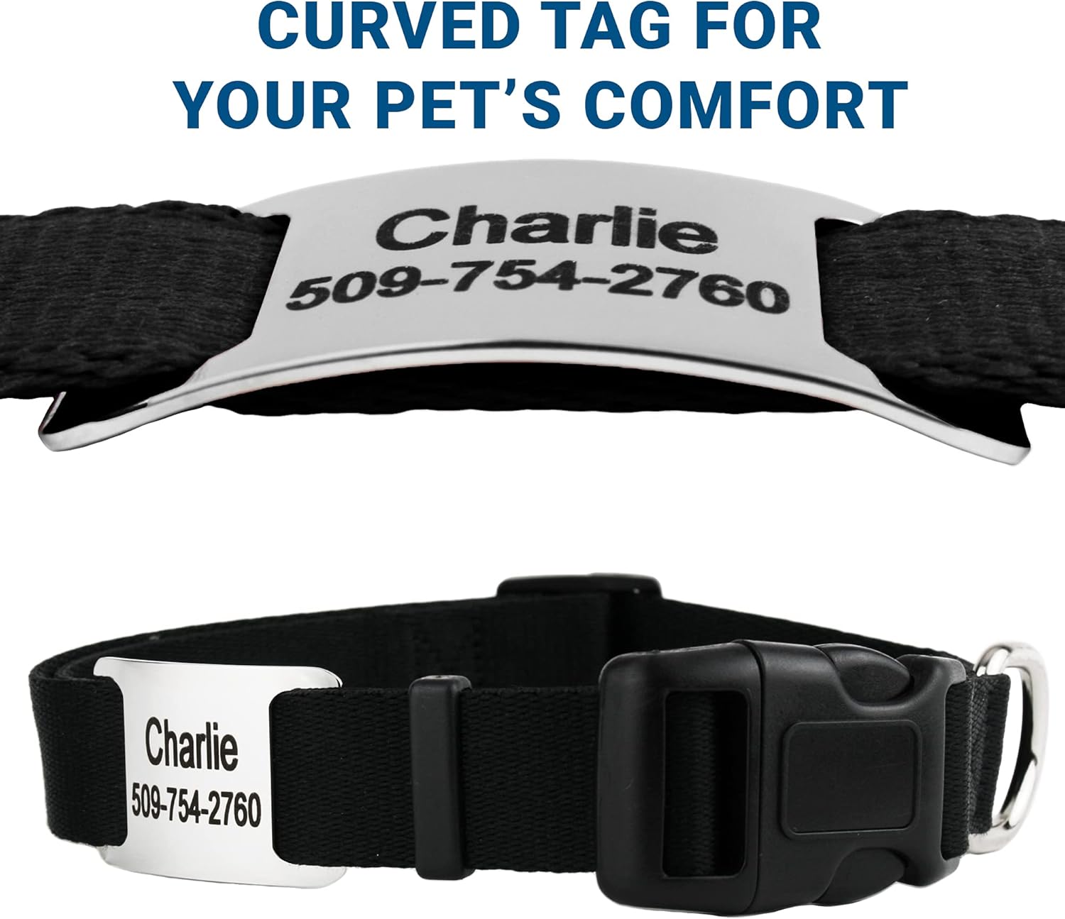 GoTags Personalized Dog Collar with Nameplate, Adjustable Dog Collar with Custom Engraved Slide On Pet ID Tag in Stainless Steel, Silent, No Noise Dog Tag for Large Medium and Small (Black, Medium)