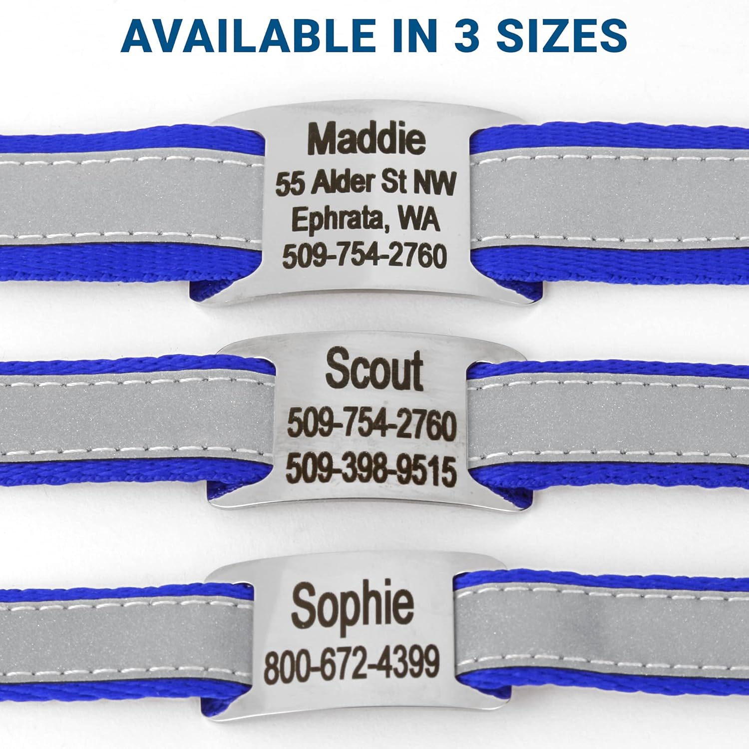 GoTags Reflective Personalized Dog Collar with Nameplate, Adjustable Dog Collar with Custom Engraved Steel Slide On Pet ID Tag, Silent, No Noise Dog Tag for Large Medium or Small (Blue, Large)