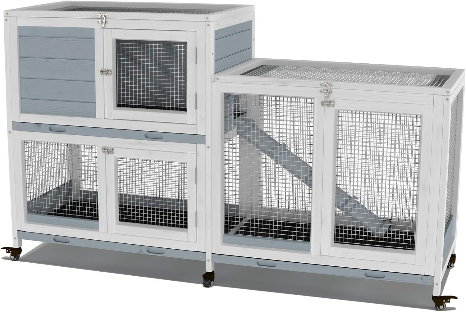 GDLF Two Floors 58" Wooden Indoor Bunny Hutch Rabbit Cage on Wheels Guinea Pig PET House for Small to Medium Animals Waterproof No Leak Tray