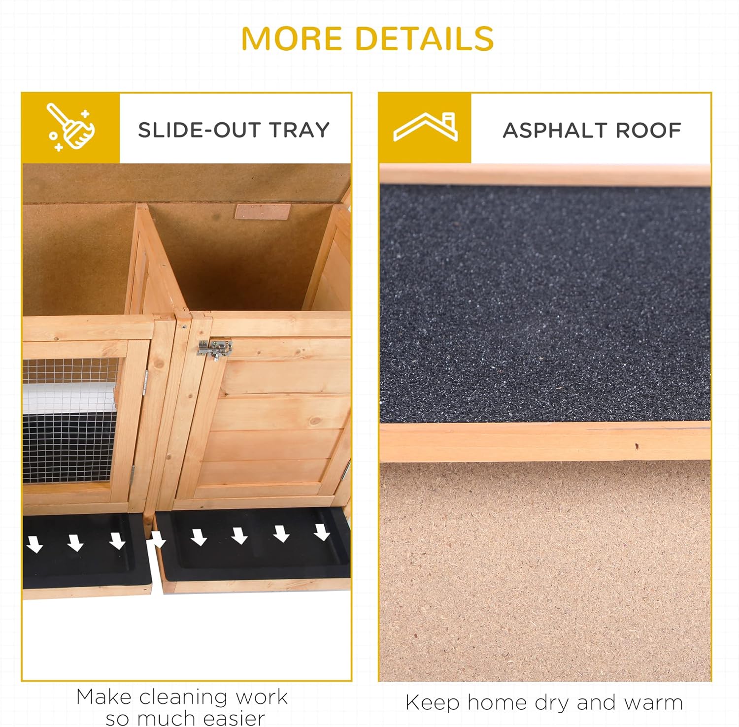 - Keep Your Pets Dry: This bunny house is made with fir wood with a composite asphalt roof to provide a stable structure and to keep your pets out of the rain.