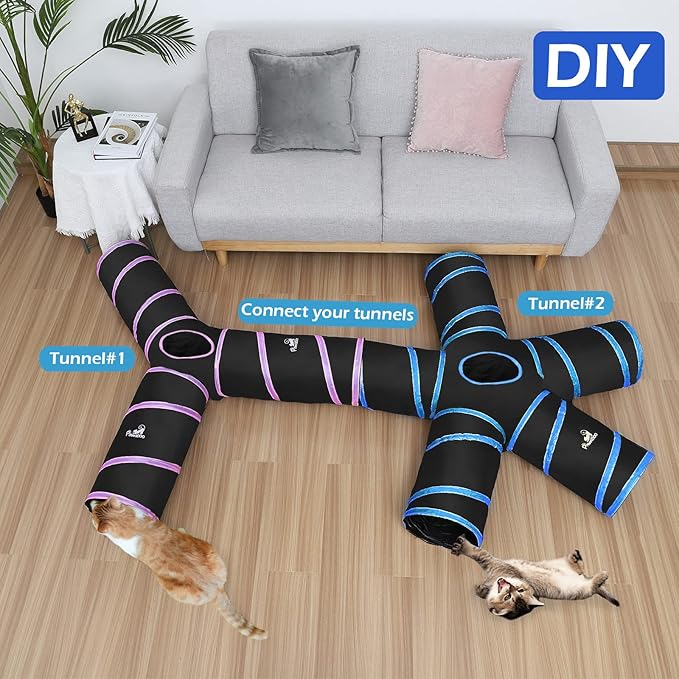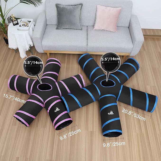 Pawaboo Cat Toys, Cat Tunnel Tube 5 Way Tunnels 25x53cm Extensible Collapsible Play Tent Interactive Toy Maze Cats House with Balls and Bells for Cats Kitten Kitty Rabbit Small Animal, Blue