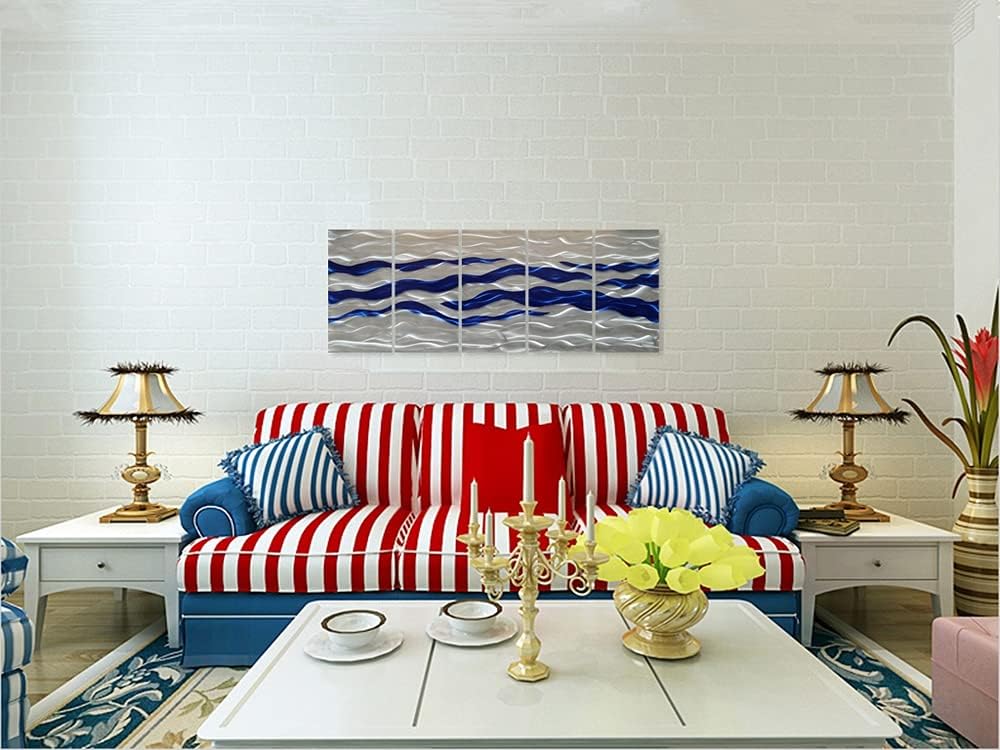 SYGALLERIER Abstract Coastal Metal Wall Art Handcrafted Big 3D Blue and Silver Artwork Modern Sea Waves Pictures Contemporary Sculpture for Living Room Bedroom Bathroom Decor