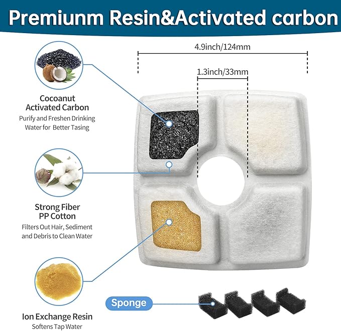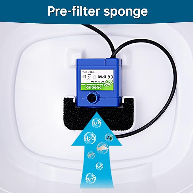 - 【High Quality】The cat fountain filter is composed of activated carbon, ion exchange resin and non-woven fabric and it can filter hair, heavy metals, and improve the taste of the water so that pets can drink clean and fresh water all day. Also, adding a pre-filter sponge around the pump to better protect the pump from impurities.