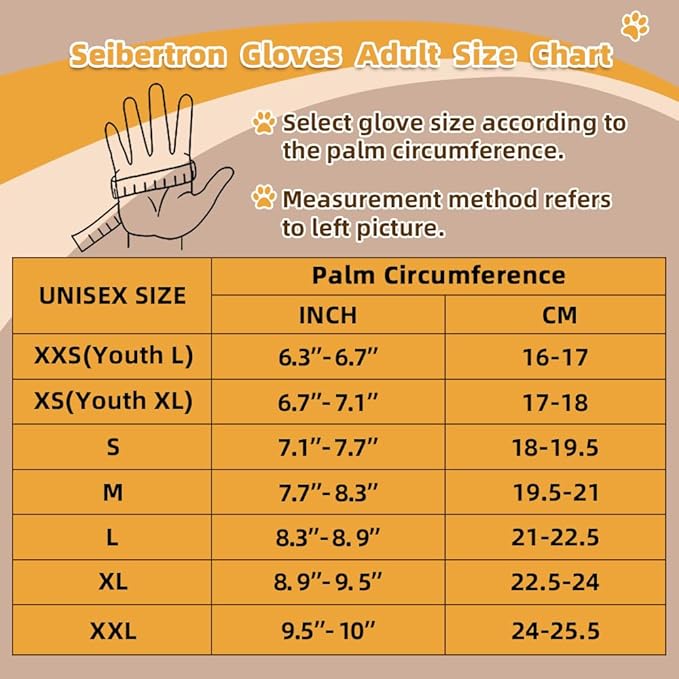 - Unique patented design with various size options for Seibertron gloves have resolved the problem of poor wearing experience like unsuitable wearing or unfitable size. Please choose the glove based on your hand circumferece according to the size chart to achieve the best using experience.