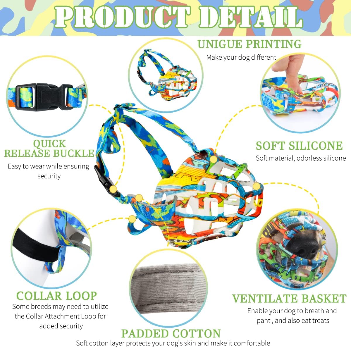 - Soft and Unique: Made of sturdy and safe silicone, it is comfortable for dogs skin and will not rub the dog's nose. There is a neoprene liner at the bottom to increase comfort. With unique printing technology, the appearance is different from the traditional basket dog muzzle, making your dog more attractive on the street