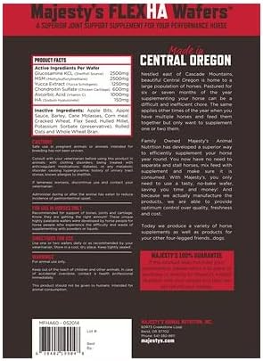 - FOUR MONTH SUPPLY - Each bag contains 60 wafers. As per directions, one bag of Majasty's Flex HA Wafers will provide your horse with the care and nutrients they deserve for two months.