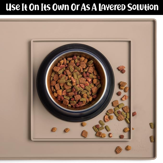 - Less Mess & Less Stress: Super high edge (0.6”) of DogBuddy Dog Food Mat keeps the spilled food and water on the mat and away from your beautiful floor. Silicone is naturally 100% waterproof, so what happens on the mat stays on the mat.