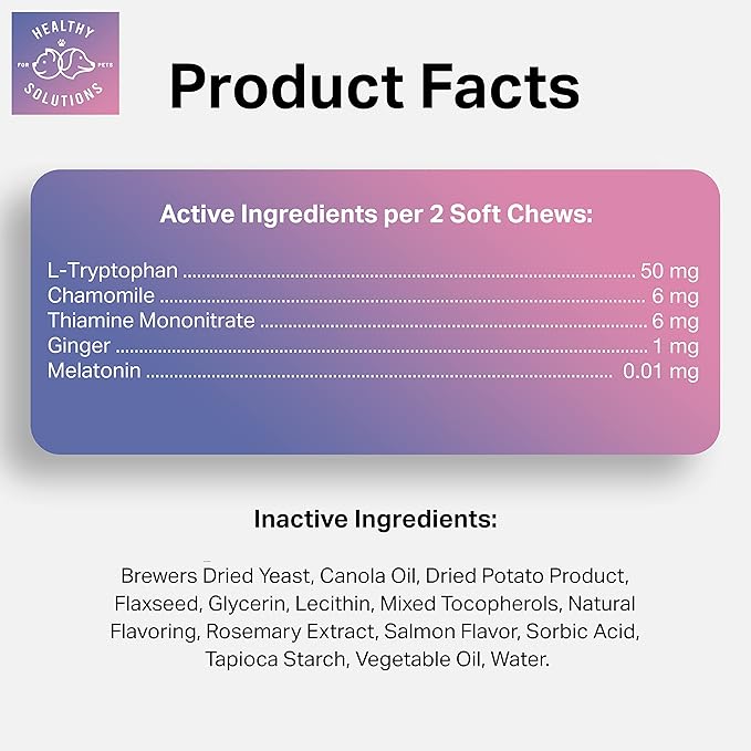 - 🗸 VETERINARIAN FORMULATED -- with Melatonin, Chamomile, Passion Flower, Thiamine, L-Tryptophan, and Ginger to help soothe sensitive stomaches.