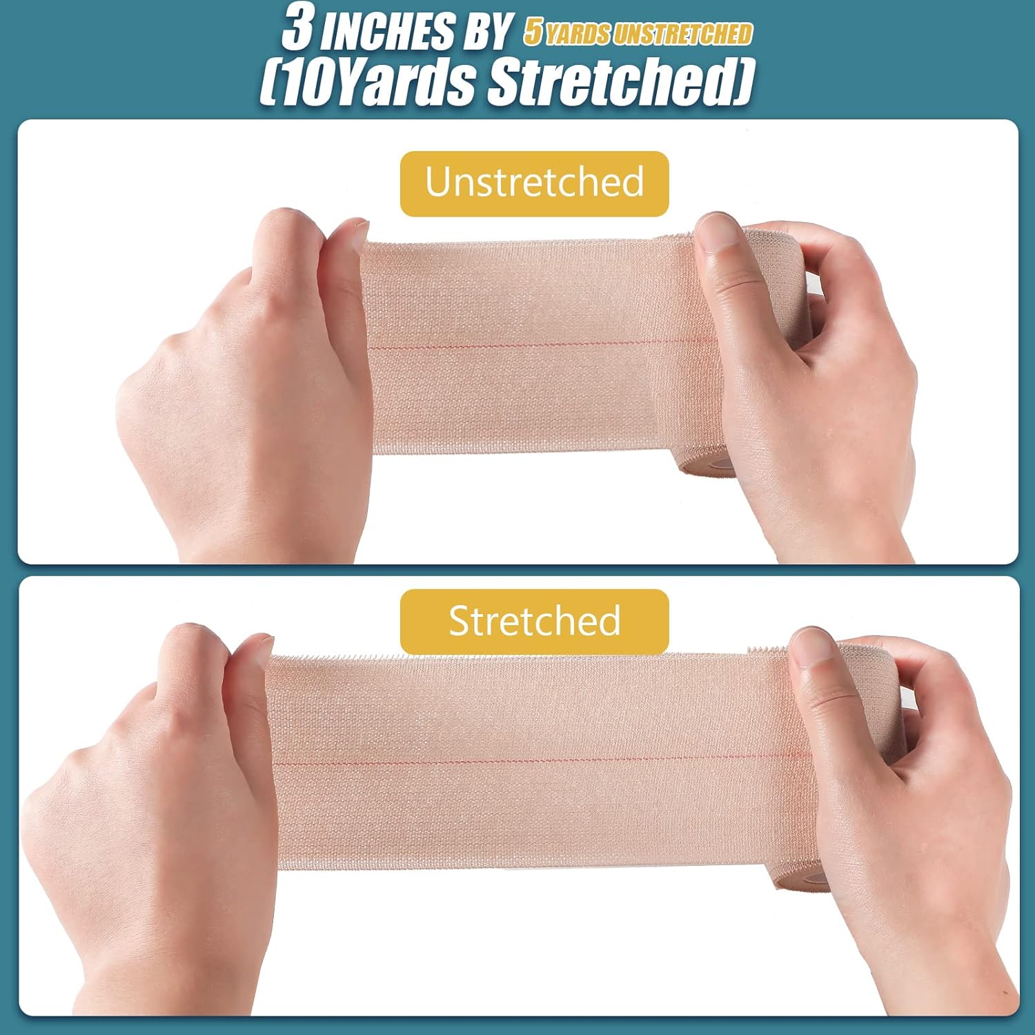 - You will get: there are 4 rolls of elastic tape, about 3 inches in width and 5 yards in length in total, which can be stretched to 10 yards in length, and can be applied according to your actual needs, long enough to meet your multiple needs