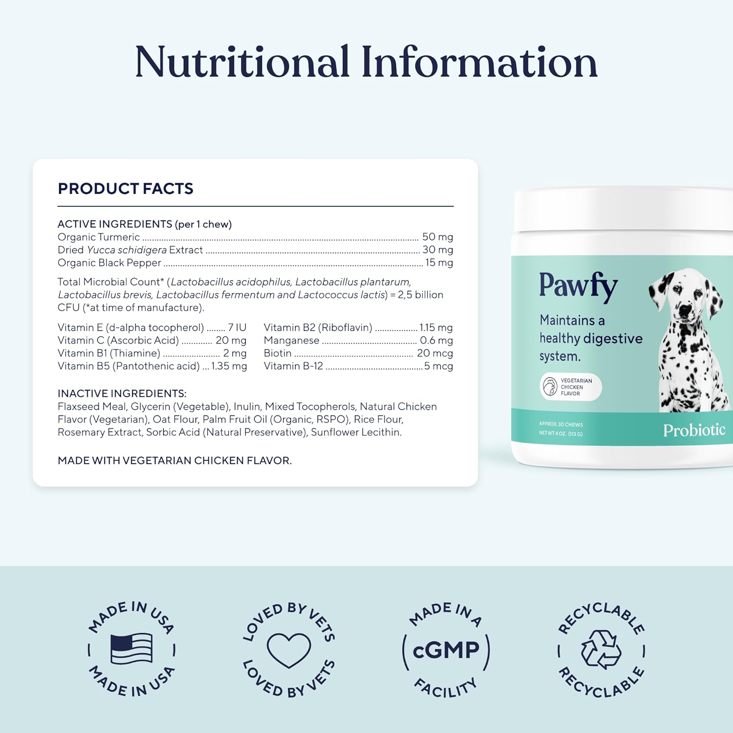 Pawfy Probiotics for Dogs | Supports Digestive Health, Diarrhea for Small and Large Dogs | Improves Gut Health | Anti Yeast Supplements | Promotes Skin Health and Seasonal Allergies Support - 30 Chews