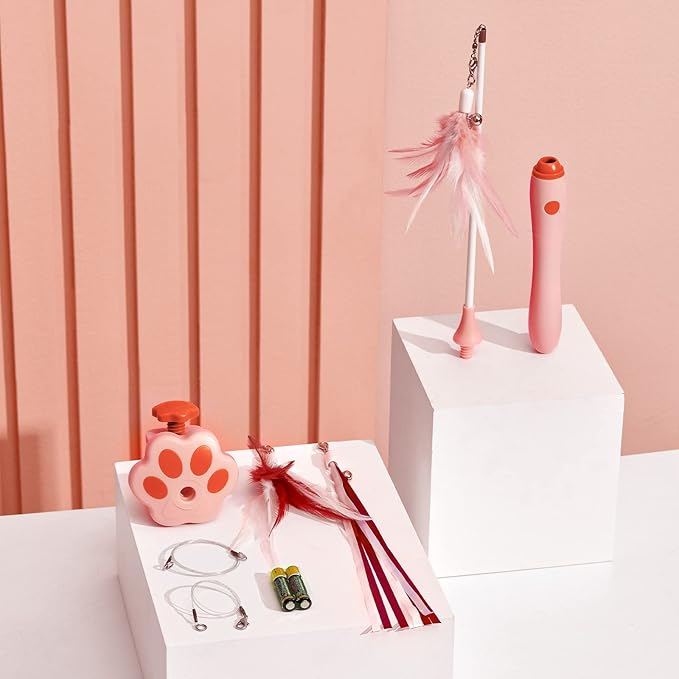 - 【MULTIPLE PLAY WAYS】①Used as a standard cat wand with the two included attachments. ②Can fix the cat wand on table, cat litter board, cat tower or door with a thickness of no more than 1.1 inch to attract cat. ③Allows you to project a red dot onto the floor and encourage your cat to chase her mysterious prey.(Batteries included)