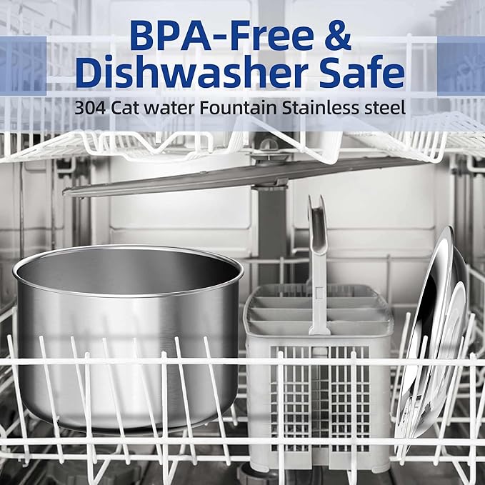 - Stainless Steel Cat Water Fountain: Size: 7.28x7.28x5.11inches(185x185x130mm), Capacity: 67oz/2L, made from food grade 304 stainless steel BPA-free and dishwasher safe, easy to clean, which is also durable, hygienic, and won’t hold onto any nasty odors.