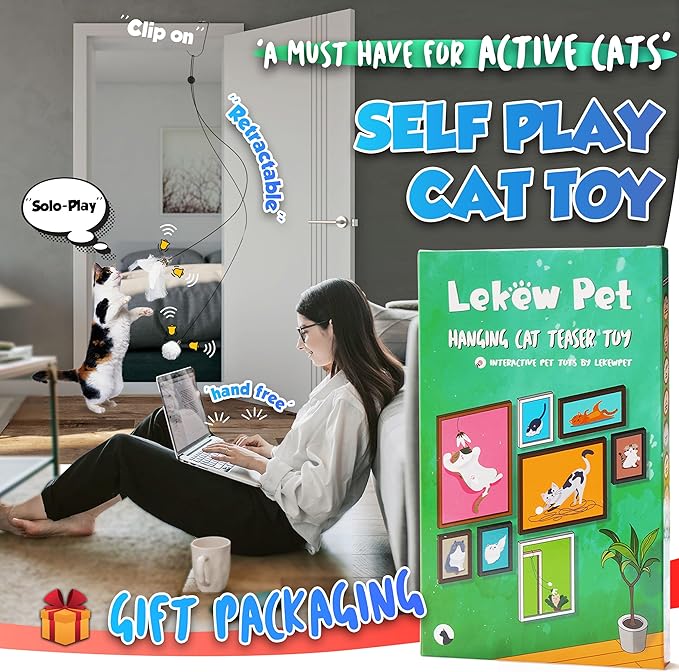 - Hanging Cat Teaser Toy: Designed to hang on door frame or anyplace, simply pull the elastic cord and the cat feather toys with bell will bounce. The charm is feather toys making crisp bell sound when your cat pounces on it, keep your cat busy, encourages your kitten to jump into play! Perfect way to provide cats with the daily exercise.