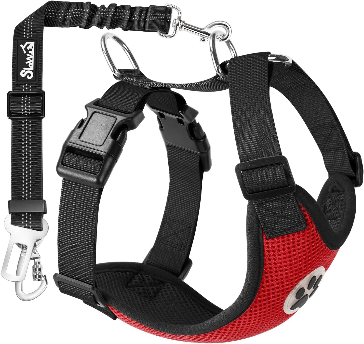- Upgraded 2 In 1 Seatbelt --- SlowTon dog harness has upgraded the connect seat belt to ensure universal fit for most of vehicles, by adding a lockable carabiner. It can be hooked to latch bar or headrest rod when traditional safety belt is not compatible with car buckle socket.