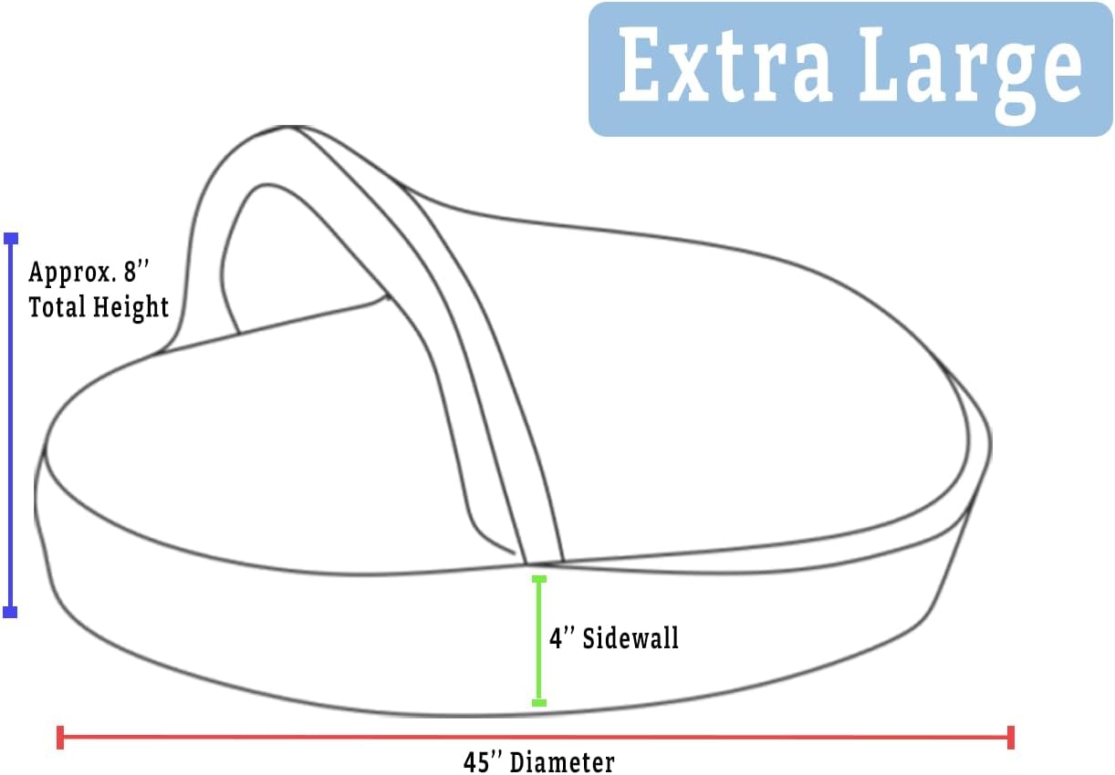 - SIZING: This Extra-Large Cozy Cave has a 45” diameter and a 4” sidewall, and is approximately 8” tall overall. A thin removable plastic tube keeps the hood open for easy entry or exit and can be removed through the small hole at the corner of the hood. This size Extra-Large provides space for larger breeds while creating a snug, enveloping feel. Please scroll down and check our size chart below for our best recommendations based on breed to ensure you buy the right size for your pup.