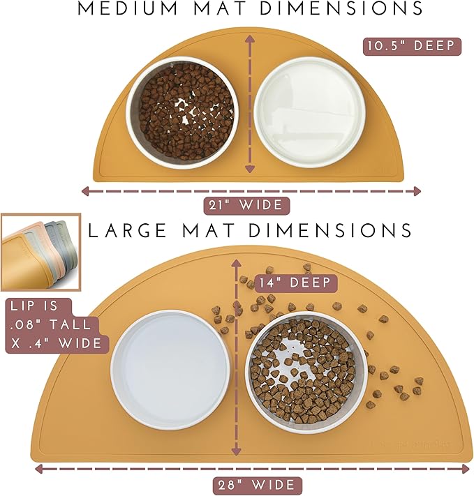 - CONTROL SPILLS AND MESSES: Our silicone pet food mat with a raised edge helps keep spills and messes on the mat. The medium size mat is 21" across x 10.5" deep. It works with bowls that are 7.5" across or smaller. The lip is .2" tall and .4" wide.