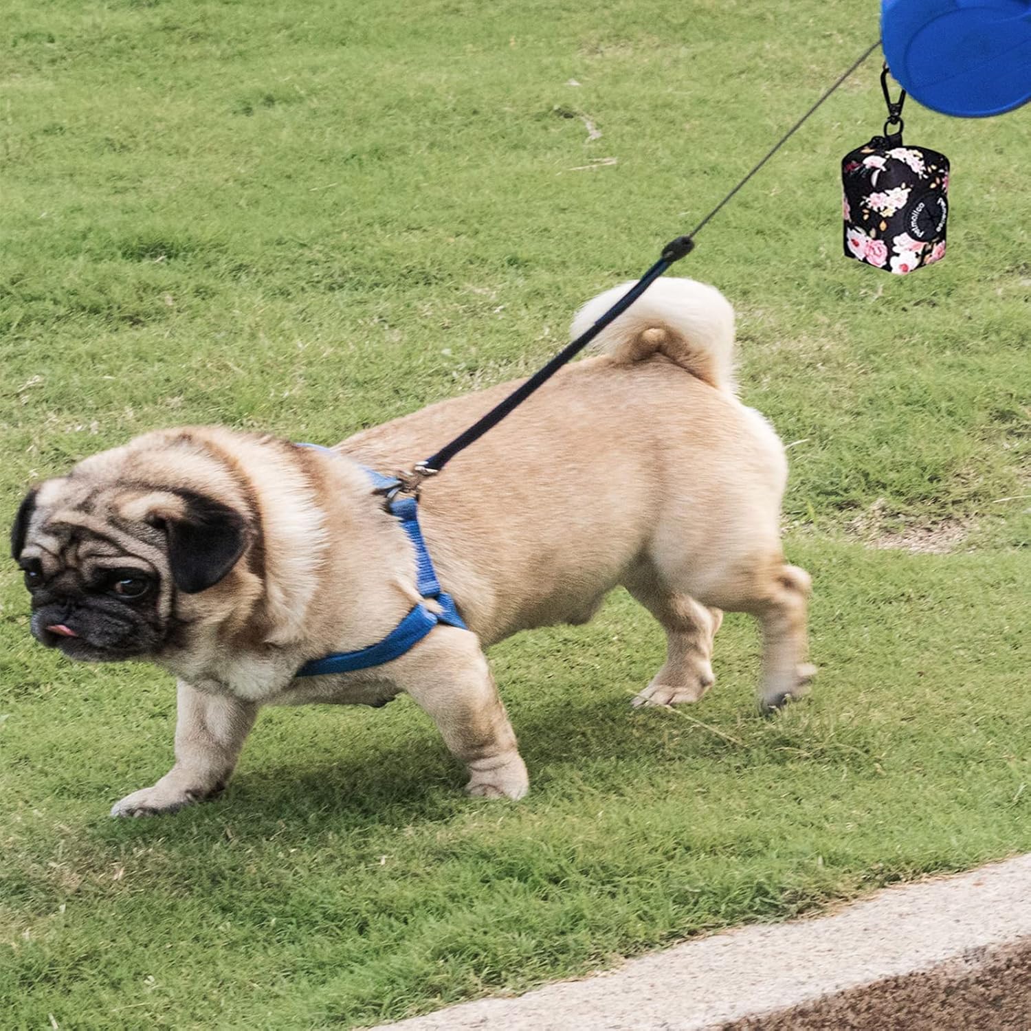 - The lightweight dog poop bag dispenser easily secures flat to any dog leash or use the metal button to attach it onto your dogs collar or harness.
