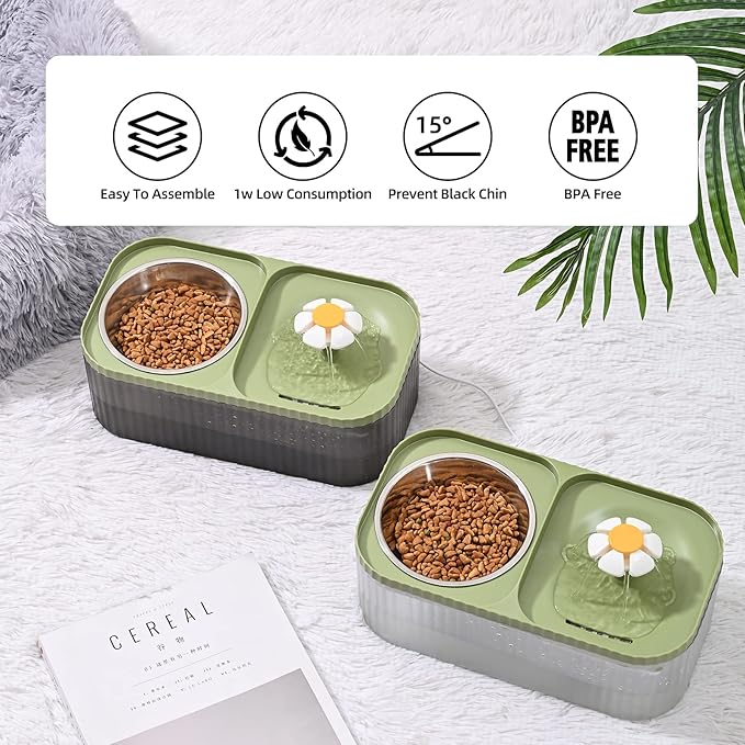 Cat Water Fountain and Food Bowl, 3L/101oz Ultra Quiet Pet Water Dispenser with Smart Pump and 3 Replacement Filters, Automatic Flower Fountain & Stainless Steel Bowl (Black & Green)