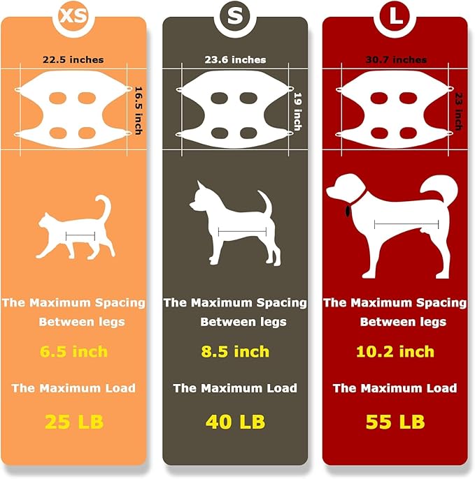 - 【Size Tip】Size XS is suitable for pets with about 6.5 inches between the front and rear legs,In order to make your pet fit perfectly with the grooming hammock, please measure the distance between your pet's legs before purchasing, and the maximum load weight is 25 lbs