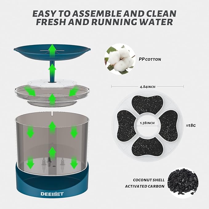 - 【Safe Water Quality Assurance】The filtration system of this pet water fountain uses coconut shell activated carbon and PP cotton for filtration, which is more effective in filtering impurities and purifying water. The outside of the pump is equipped with a high-density U-shaped sponge, which can effectively filter food debris and animal hair into the pump to achieve a second layer of filtration.