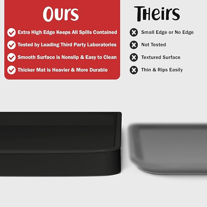- Less Mess & Less Stress: Super high edge (0.6”) of DogBuddy Dog Food Mat keeps the spilled food and water on the mat and away from your beautiful floor. Silicone is naturally 100% waterproof, so what happens on the mat stays on the mat.