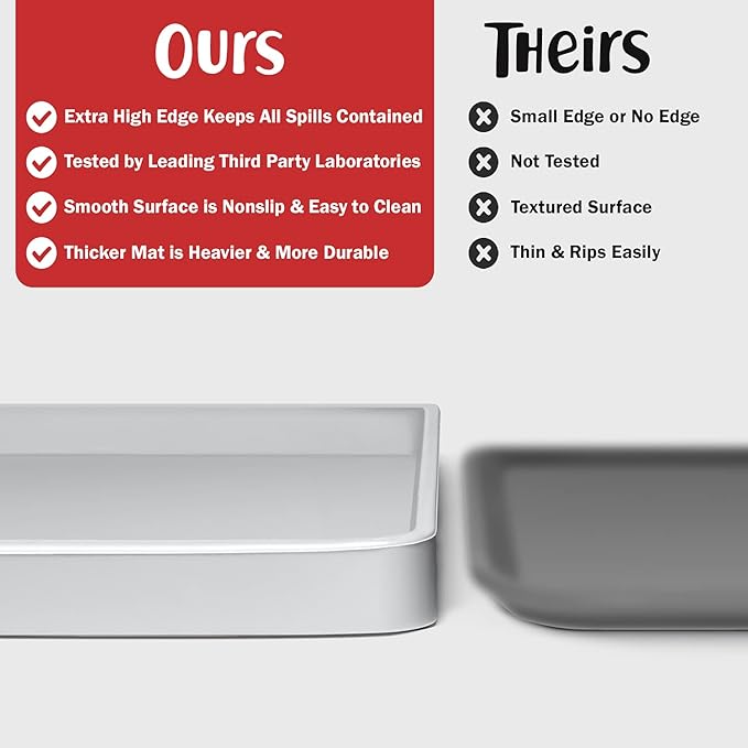 - Less Mess & Less Stress: Super high edge (0.6”) of DogBuddy Dog Food Mat keeps the spilled food and water on the mat and away from your beautiful floor. Silicone is naturally 100% waterproof, so what happens on the mat stays on the mat.