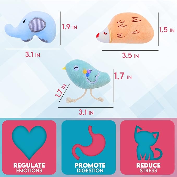 - CATNIP TOYS FOR HEALTHY ACTIVITY: Besides making your cats extra relaxed, our catnip toys feature unique shape animals that encourage cats' physical activity. For anxious cats, these toys can reduce stress, help satisfy your cat’s urge to bite, develop coordination, and increase your cat's physical fitness through exercise. Great for small animals such as kittens, dogs, puppies, etc.